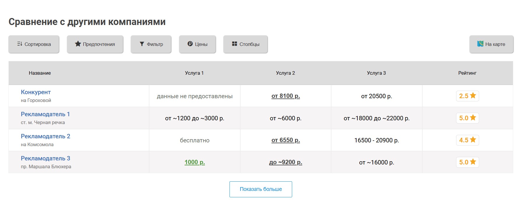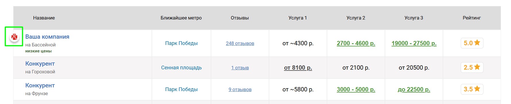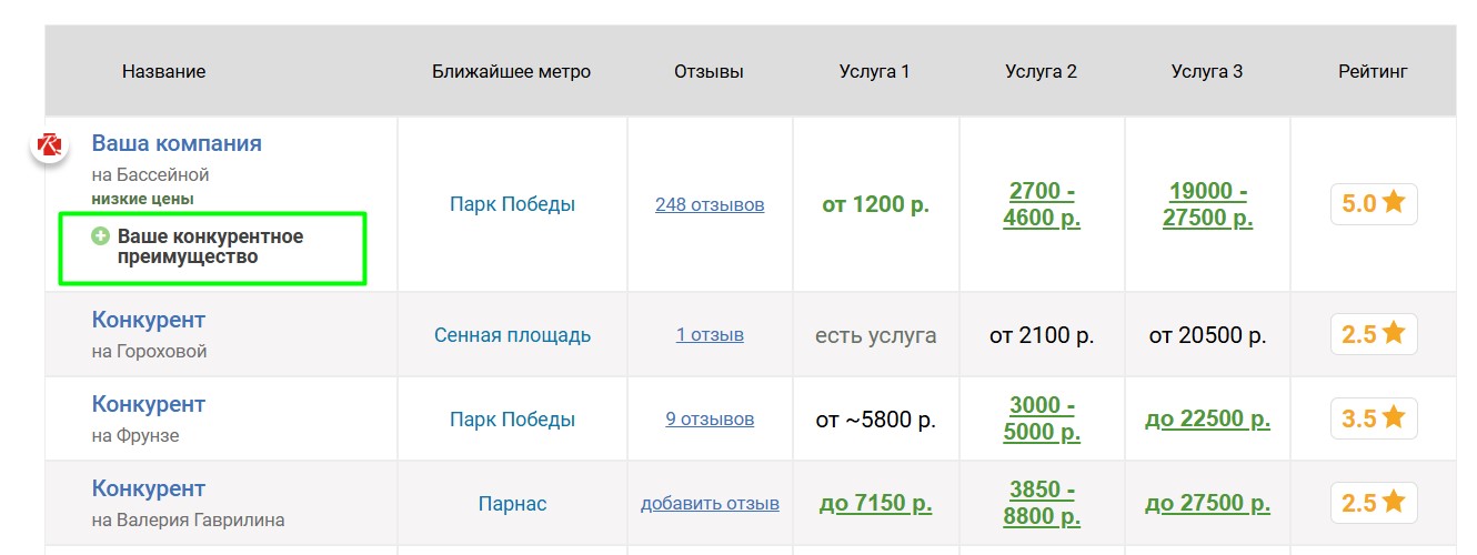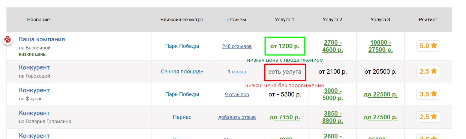 Вокруг продвигаемого таким образом автосервиса выбирается некоторое количество ближайших конкурирующих автосервисов, продвигаемый автосервис попадёт к ним в таблицу «Сравнение по ценам», которая выглядит следующим образом: